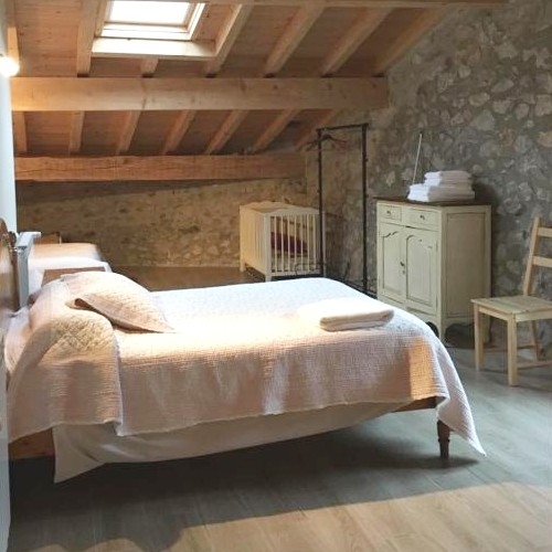 Las habitaciones tienen decoración rústica moderna con paredes de piedra vista y techos de madera.